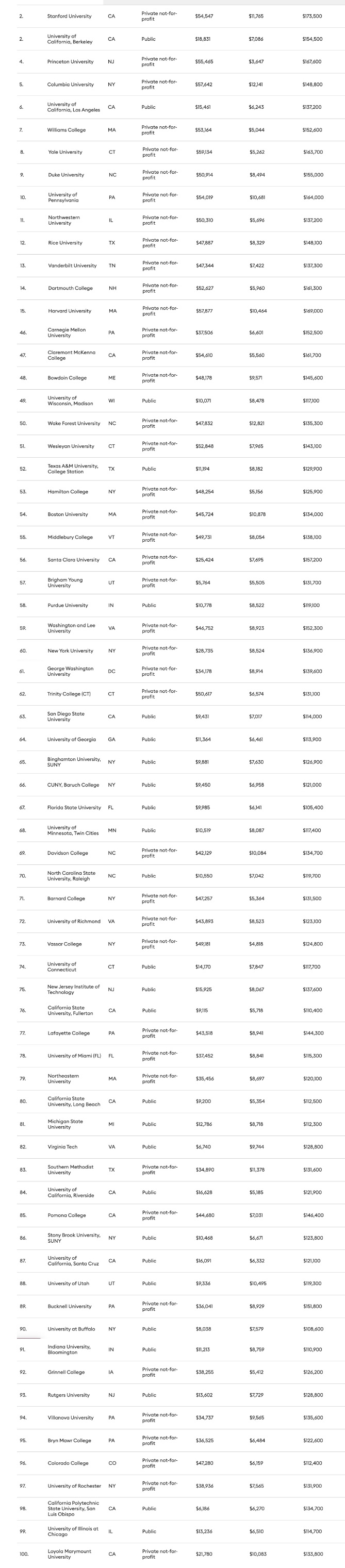 下面一起来看看今年福布斯美国大学排名TOp100的完整榜单: