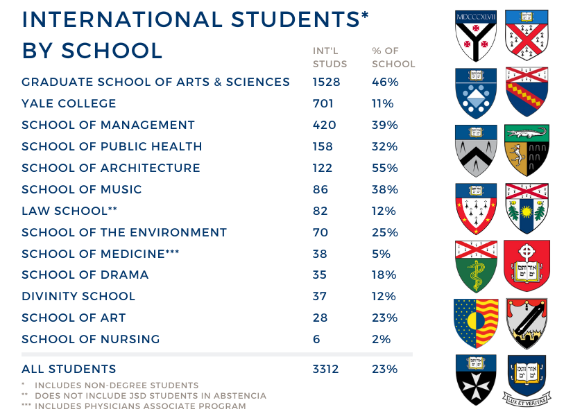 2021年,耶鲁大学的3312名国际学生来自120个不同的国家,占总招生人数的23%