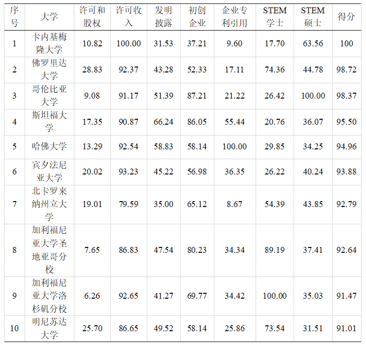 美国卡内基梅隆大学(CMU)位居首位,显示了顶级计算机科学和工程系与跨学科研究在大学之外创造的经济机会。其次是佛罗里达大学,拥有庞大的学生群体(2020年招生超过5.3万)和研究企业。哥伦比亚大学(第3)、斯坦福大学(第4)和哈佛大学(第5)和宾夕法尼亚大学(第6),拥有充足的研究预算,近年来更加注重技术转移,每年大量STEM人才毕业。