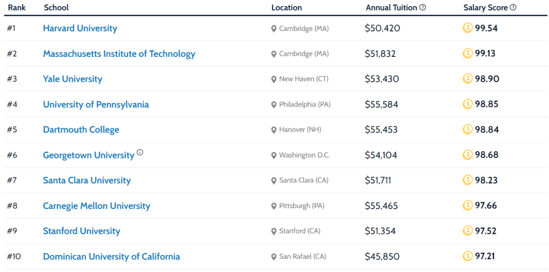 结果显示,本次排名前十的学校分别是:哈佛大学、麻省理工学院、耶鲁大学、宾夕法尼亚大学、达特茅斯学院、乔治城大学、圣克拉拉大学、卡耐基梅隆大学、斯坦福大学和加州多明尼克大学。