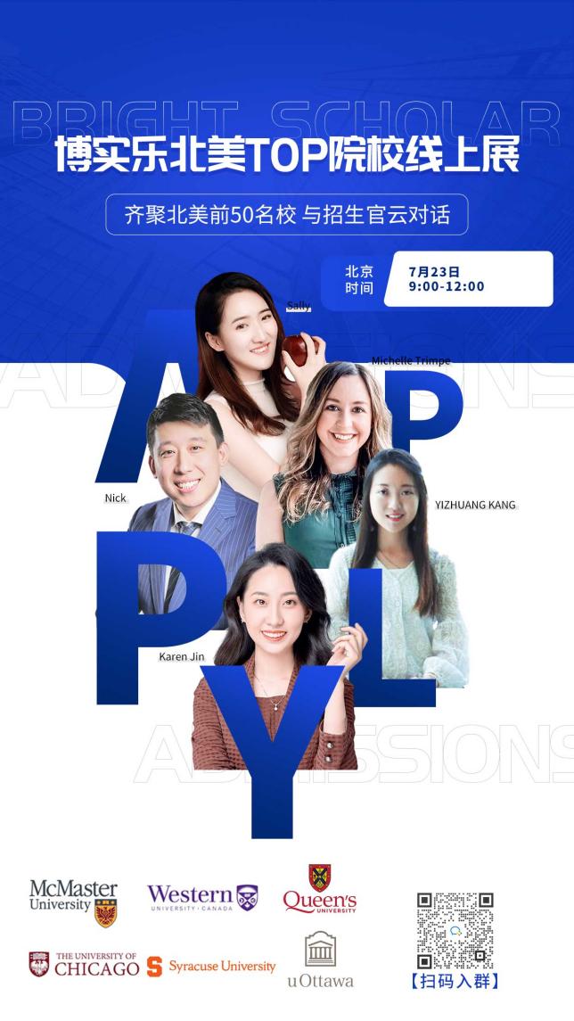 博实乐在7月23日上午8:30-12:00(北京时间),组织了一场北美TOp院校线上展,活动齐聚北美前50名校,在线与名校招生官云对话,还有哈佛、芝加哥大学等校友分享留学经历。