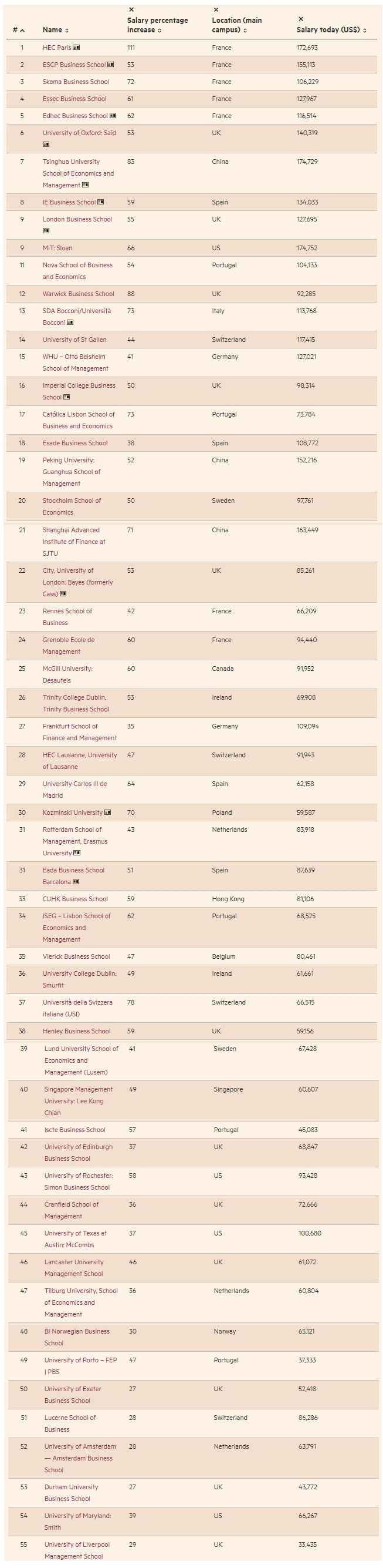 巴黎高商HEC paris自2018年以来,连续位列该榜单第1名。巴黎高商的核心竞争力是校友薪资涨幅,该校学生在毕业三年后的工资增长幅度最大,平均工资排名第三,年薪接近17.3万美元。学校的职业服务和国际流动性方面得分也很高。