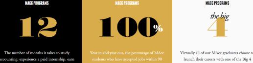 MAcc Assurance项目毕业生的就业率为100%,平均工资为63000美元+绩效奖金,几乎所有的毕业生都选择在四大会计师事务所之一(毕马威,德勤,普华永道或安永)开始他们的职业生涯,在5年内,我们的大多数毕业生在公司内部都达到了6位数的薪水。美国会计研究生