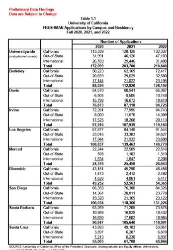 总体而言,申请UC的学生从2020年的17万人,2021年的20万人,上涨到了今年的21万人。UC Berkeley申请人数2021年突破10万,达到11万2千人;2022年达到12万8千人。UCLA在2020年已经突破10万,为10万8千人;2021年几乎14万人;2022年达到几乎15万人,2年时间几乎突破了50%。UCI2021年达到10万7千人、UCSD2020年10万人、UCSB2021年也达到了10万5千人。总之,就是申请人数越来越多。