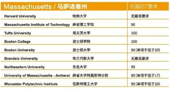 那么马萨诸塞州有你的目标院校么?看看下面这份表单。很多同学一看哈佛大学的托福成绩要求感觉一怔!什么,无最低要求?