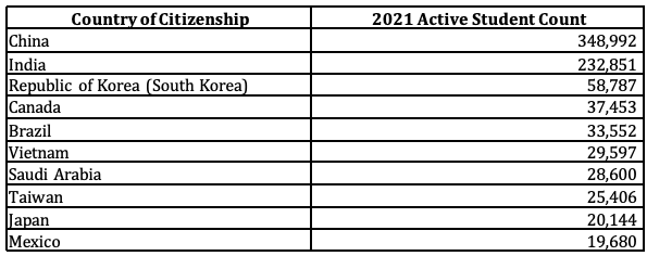 其中中国大陆学生共348,992人,比2020年下降33,569人(降幅-8.77%);但仍是美国最大的海外留学生来源地。