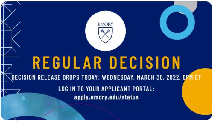 埃默里尚未披露录取数据、在早申请(ED1)轮次,该校共收到2,205份入学申请,其中804名申请人获得入学邀请;在随后的ED2阶段招生办再次收到至少1,917份(其中埃默里学院和牛津学院分别收到1,817和1,110份)ED2申请,超过260名(其中埃默里学院和牛津学院分别录取259和143名)学生获得录取。绝大多数埃默里本科申请学生同时申请埃默里和牛津学院,相当数量的录取学生获得两个校区入学邀请。美国埃默里大学