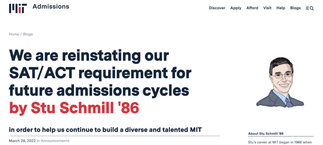 Stuart Schmill说:“我们不喜欢满分,满分也不足以说明你会在MIT取得成功。”恢复标化考试要求的目的,是为了使申请过程更加平等,更加透明。