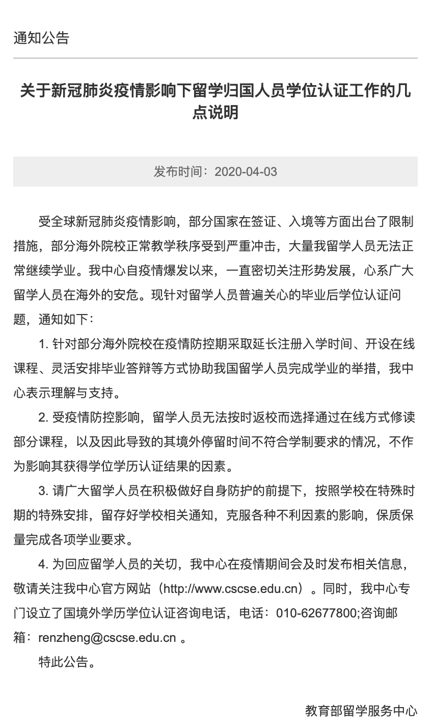 2、受疫情防控影响,留学人员无法按时返校而选择通过在线方式修读部分课程,以及因此导致的其境外停留时间不符合学制要求的情况,不作为影响其获得学位学历认证结果的因素。