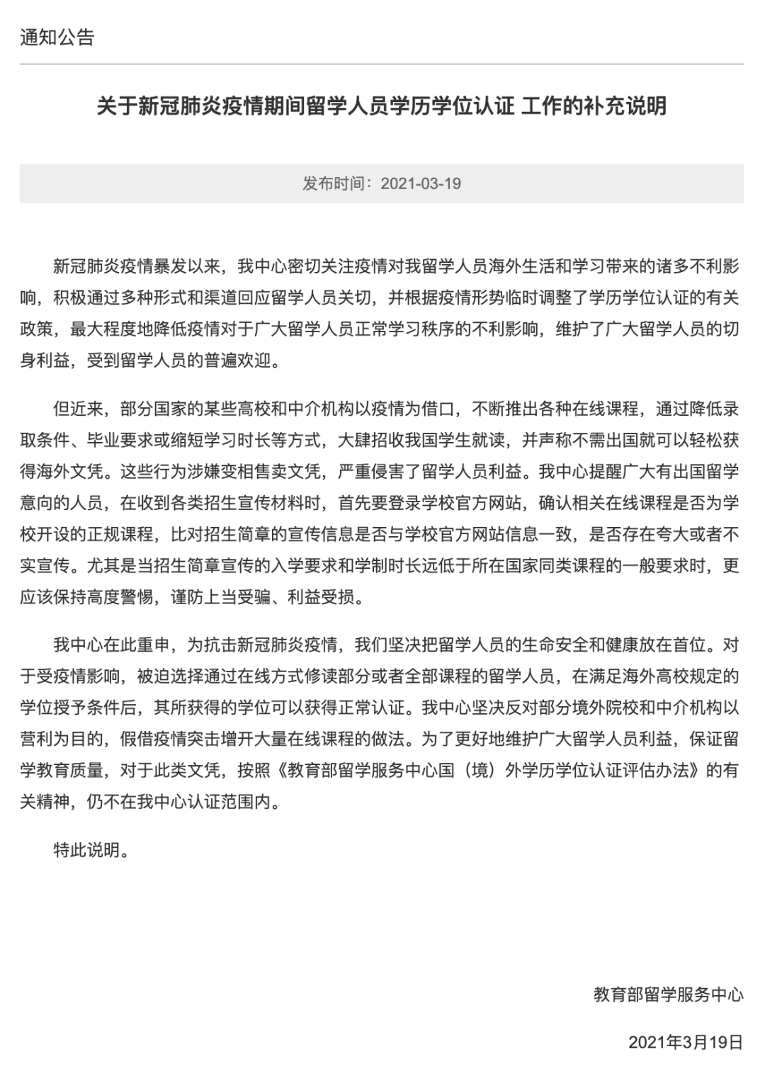 在2021年3月,教育部留学服务中心又补发了一个通知: