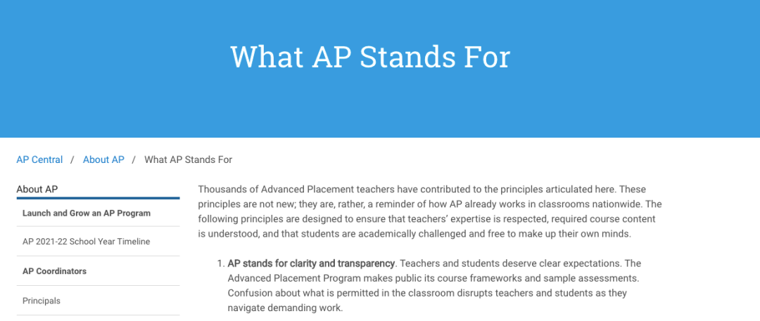 文章指出:这些原则是Ap共同教师认可的,家长和学生在选择Ap课程后,需同意这些原则之下的课堂教学;如学校禁止Ap课程的必修课题,其Ap中心授权或将被撤销。