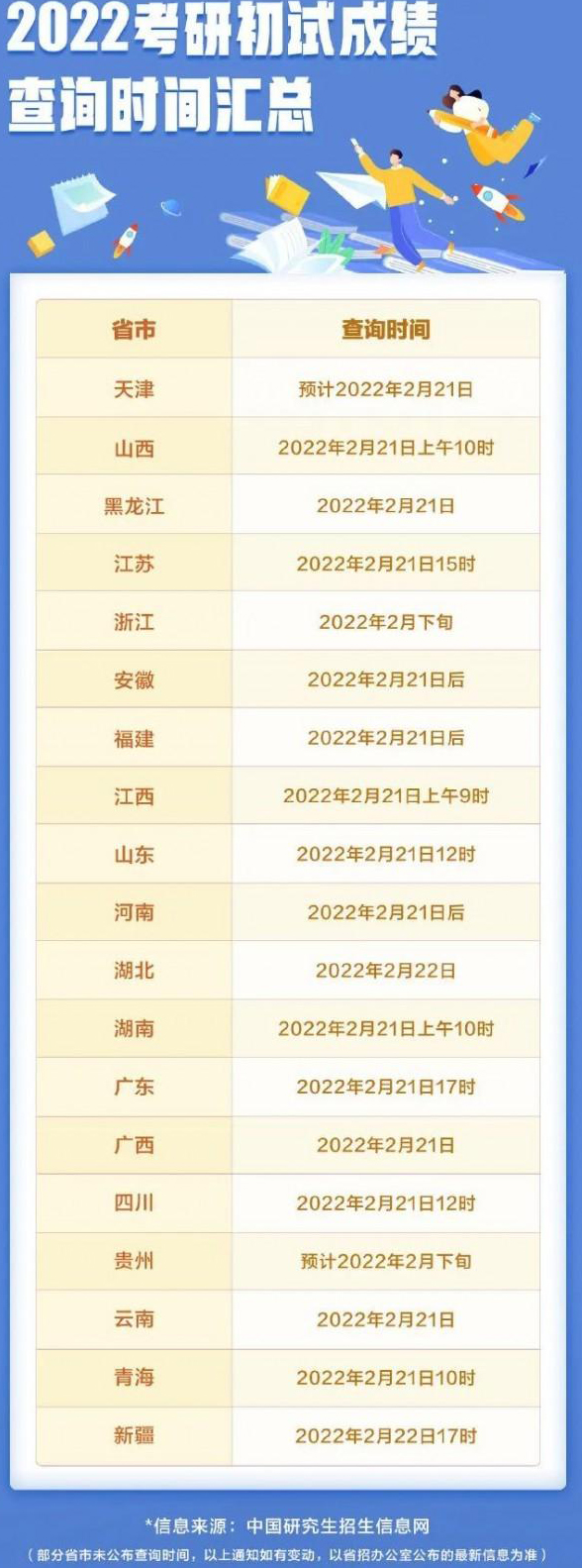 据各地发布的通告,江苏、山西、湖南、山东、黑龙江等地考生均可于21日查询2022年度考研初试成绩,湖北考生可于22日查询考试成绩,江西、浙江等地初试成绩查询时间为2月下旬,另有部分省份尚未公布成绩查询时间。