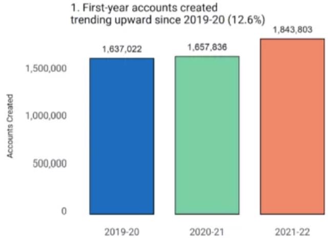 2021-2022申请季创建账户数量高达1843803人,而2019-2020年的创建数量只有1637022人,创建数量增长了将近12.6%。