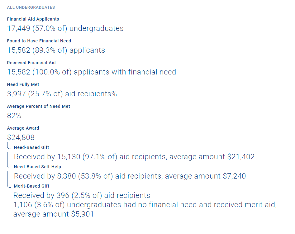 在“Merit-based Gift”的标题下,只能看到一小部分受助人(3.6%)获得了优秀奖学金。下一行显示3.1%的新生没有经济需求,并获得了平均6022美元的优秀奖学金。