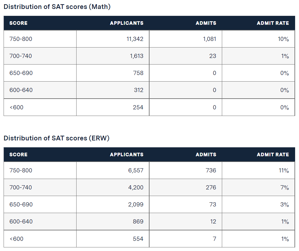 通过表格,我们可以明显看出,SAT数学和ERW(阅读与写作)在750-800分的同学,在申请过程中将有十分明显的优势。