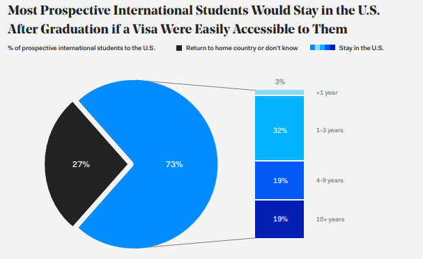 拥有一份海外工作经历对是国际生非常大的加分项。FWD.us调查,在2021年赴美留学的国际生中,有73%的学生表示,如果他们毕业之后能获得签证,那么他们愿意留在美国生活和工作,其中又有38%的学生希望能够留在美国工作的时间超过4年。(比STEM领域的OpT还要久)