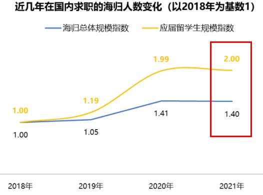 智联招聘最新发布的《2021中国海归就业调查报告》显示:2020年由于疫情原因,投递国内岗位的海归数量较2019年猛增33.9%,其中应届留学生人数猛增67.3%。
