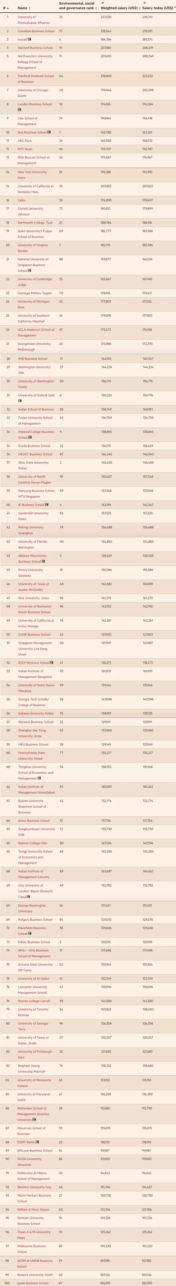以下是此次《金融时报》MBA项目前100名学校及其毕业生工作收入等部分数据。更多排名权重因素数据可查阅官网:https://rankings.ft.com/rankings/2866/mba-2022