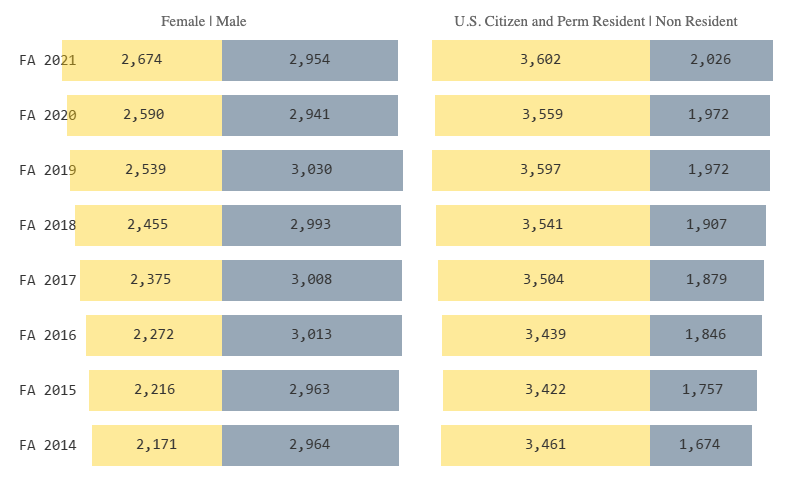 密歇根大学Rackham研究生院管理的所有博士专业学生构成,从2014年至2021年,博士生中的女性和国际学生数量保持较快上升水平。