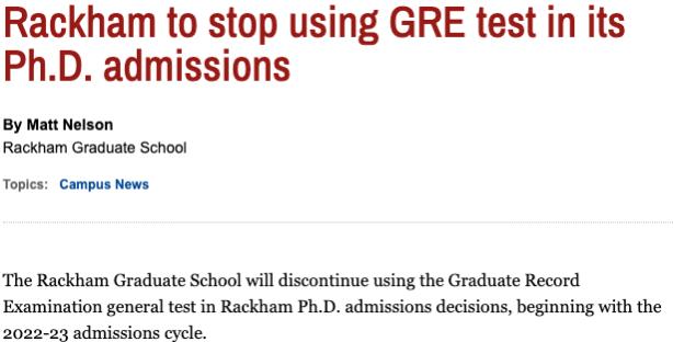 近日美国密歇根大学Rackham研究生院宣布,从2022-2023申请季开始,该校博士专业申请中,申请人不再需要提交GRE成绩。