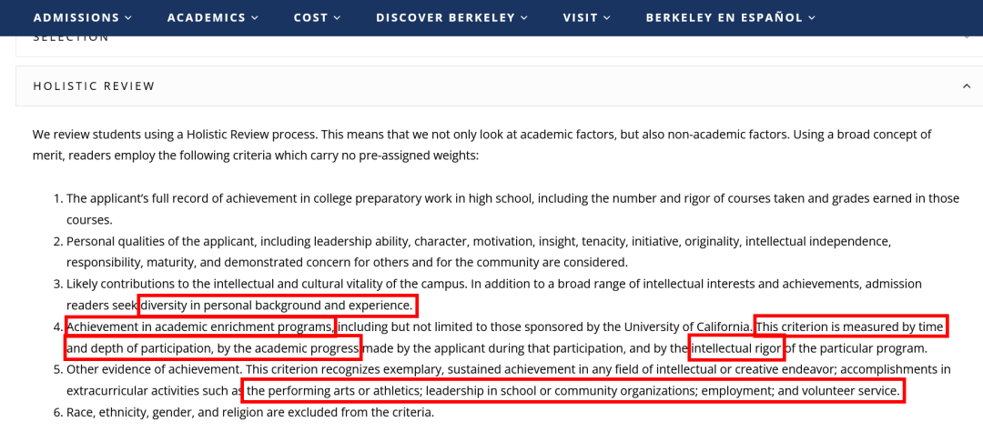 “我们使用整体审查程序来评估申请者,这意味着我们不仅要看学术因素,还要看非学术因素。我们采用不同的标准来进行衡量,其中包括: