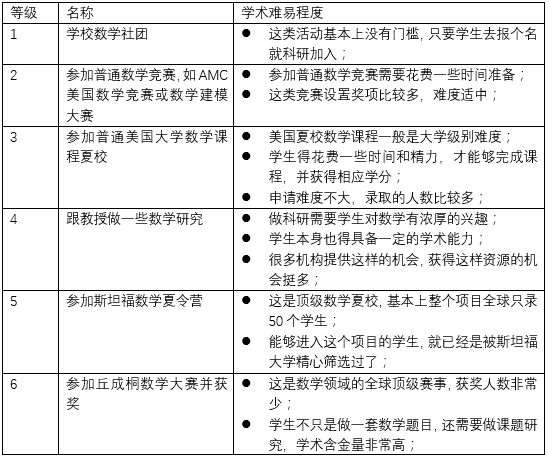 而学生所参与的学术活动为招生官评估其学术能力提供了依据,我们以申请数学专业的学生为例,学生可能参加以下不同程度的活动。