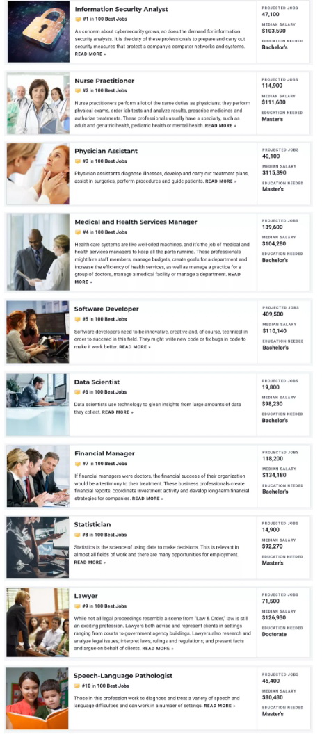 不难发现,在今年的职业排名中,医疗保健相关的职业取得了不俗的成绩。事实上,在今年的Op100中,与医疗健保相关的岗位占据了40%,这也充分说明了医疗保健行业才是当下美国社会最受欢迎、需求量最大的职业领域。
