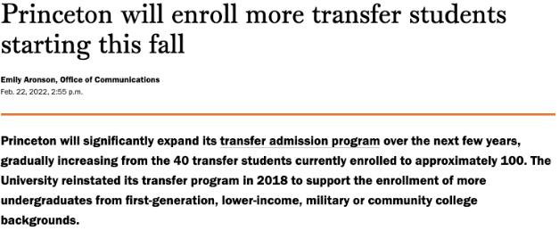 此外普林斯顿大学在去年11月就批准扩大转校学生(transfer student)的招生规模计划,转校学生的录取数量预计将翻倍!