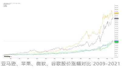 我们看FAAMG五大科技公司,有四家在过去一轮牛市中涨幅远超十倍,其中苹果48倍、微软18倍、谷歌17倍、亚马逊55倍,另外一家脸书2012年才上市,至今9倍。