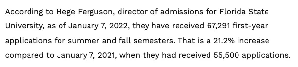 这一数据是即将离任的佛罗里达大学校长Kent Fuchs在给全校师生的一份邮件中公布的。佛罗里达州的另一所公立大学——佛罗里达州立大学(Florida State University)的申请人数也出现暴涨。该校共收到67291人的2022年秋季本科新生入学申请,比2021年55500人增长21.2%!该消息由学校招生办主任Hege Ferguson透露。