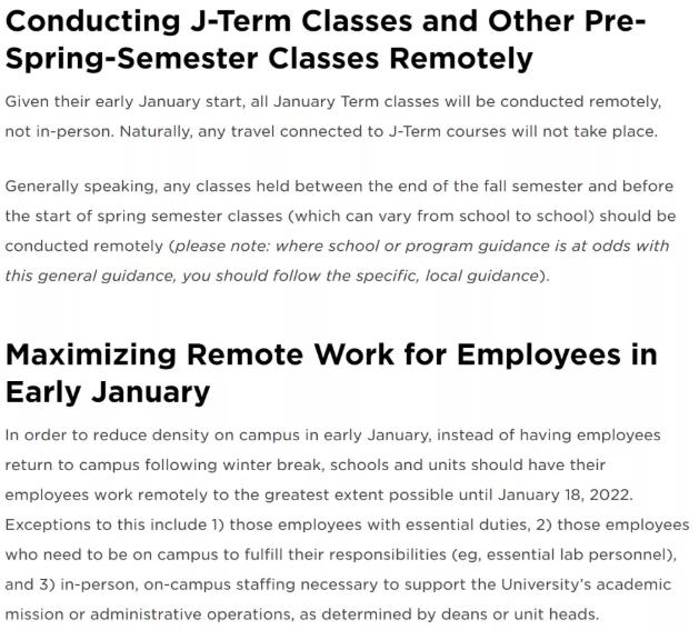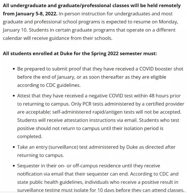 杜克大学于上周正式确认所有本科生和研究生的春季课程都将先以远程的形式开始,从1月5日持续到1月8日,线下面对面的教学预计将于1月10日起恢复。