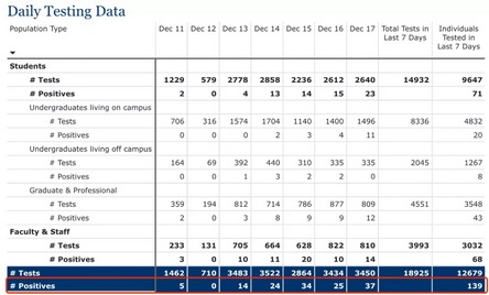 而这个周新增数字已经远超了上周拉响最高校园疫情红色警报的康奈尔大学(276例)。