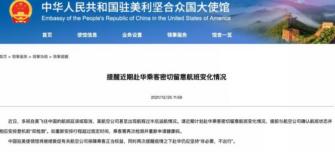 中国驻美国大使馆网站12月25日发布提醒称,近日,多班自美飞往中国的航班延误或取消,某航空公司甚至出现航程过半后返航情况。请近期计划赴华乘客密切留意航班变化情况,提前与航空公司确认航班状态并相应安排登机前“双检测”。如重新安排行程超过规定时间,乘客需再次检测并重新申请健康码。美国出境