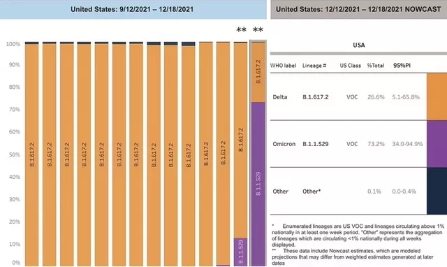 短短不到一个月的时间,Omicron已经领先其他变体,成了美国主流的新冠病毒版本,占上周新感染人群的73%,这也就意味着在全美大部分地区,Omicron流行率甚至已经高于73%。