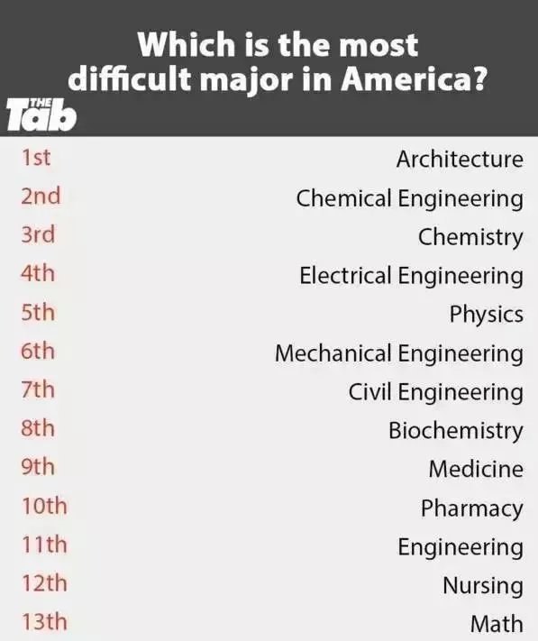 那么在美国读大学,什么专业最难学?美国著名网站TheTab根据各个专业的学习时长、通宵熬夜程度、午睡时间、GpA以及学生感到的压力程度等几个因素进行综合评估,得出了这个榜单。