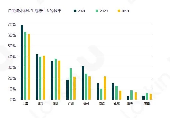 上海作为连续几年以来最受海归欢迎的发展城市,2021年支持率高达70%,远高于排在二三位的北京和深圳。