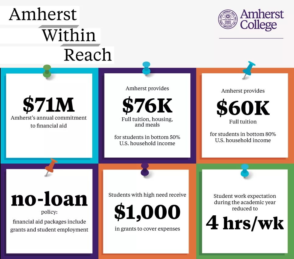阿默斯特学院目前的助学金政策已经是美国高校中最慷慨的政策之一。学院是美国唯一一所文理学院在录取过程中对美国国籍和绿卡持有者以及国际学生采用一视同仁的“盲录政策”(need-blind admission),并在学生被录取后提供全额按需补助(meet 100%of demonstrated need)并不包含任何贷款(no loans)。在美国采用此政策的只有包括阿默斯特学院在内的四所大学。目前学院75%的国际学生接受助学金补助,平均补助金额为每人每年68518美金。