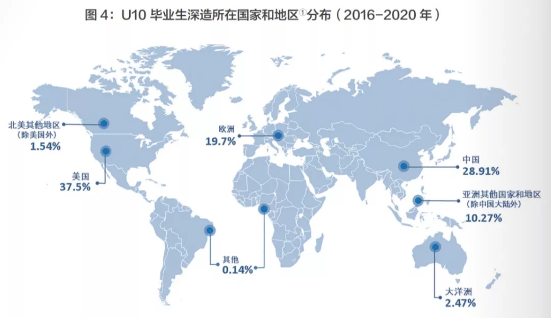 美国仍是U10毕业生深造的主要目的国、从深造国家和地区分布来看,U10毕业生选择在中国高校继续深造的比例近三成,为28.91%,而超过七成的毕业生仍选择赴国(境)外留学。其中,美国作为集聚全球优秀高等教育资源的国家,仍为U10毕业生选择继续深造的首要目的国,占比为37.50%。