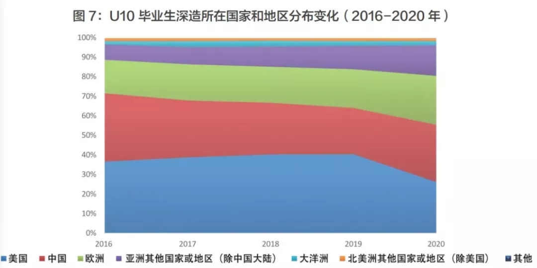 然而在U10毕业生深造所在国家和地区分布的变化来看,虽然美国仍是U10毕业生深造的首要目的国,但在2020年,这一比例明显呈现下降趋势,而中国、欧洲和亚洲其他国家或地区(除中国大陆),这一占比则呈现上升趋势。出国留学就业