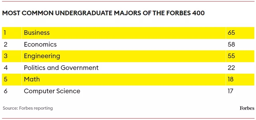 据悉在最新统计的福布斯2021福布斯财富400强之中,最受欢迎的本科大学专业是商科,其次是经济学和工程学。让人难以执行的是,计算机科学仅排第6,跟前三相距甚远。