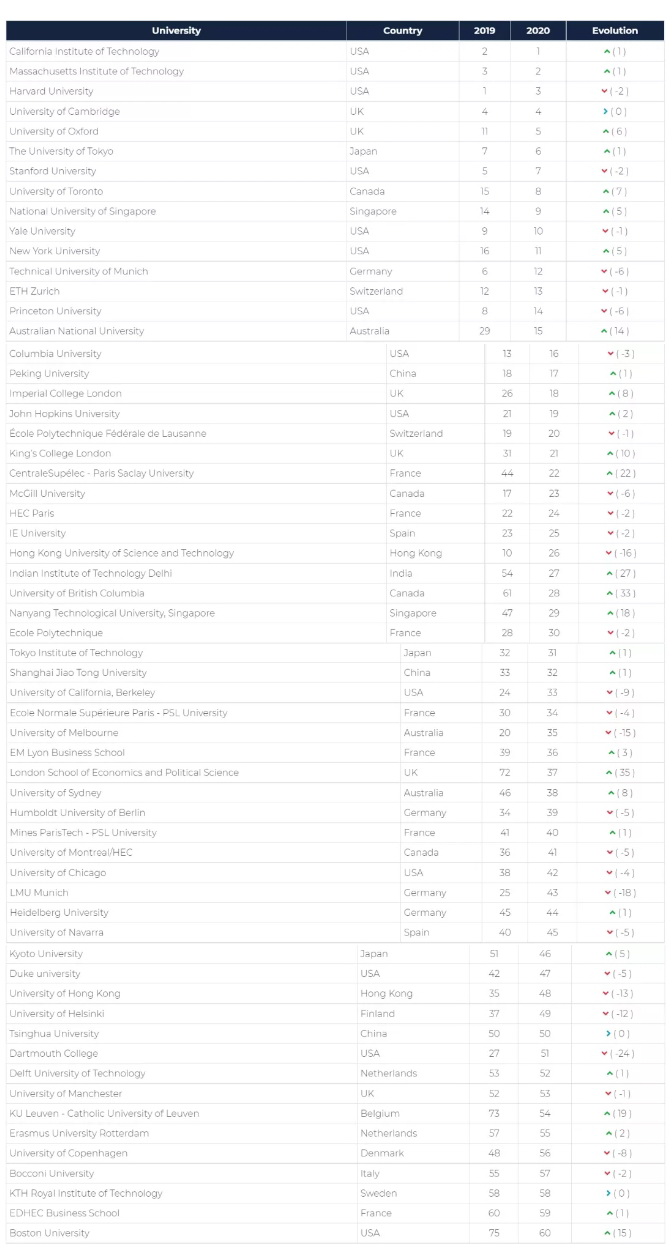 来自44个国家和地区的大学进入了排名前250名,其中美国、英国和法国的代表学校最多。