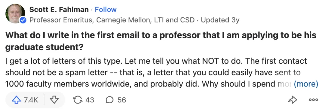 Scott E.Fahlman提到:“有些申请人发来的邮件用“Dear professor”作为对我的称呼,甚至连学校名字和项目名字都不出现,也没有提到我的科研内容,更没有提到自己的兴趣和能力与我的科研项目有什么关系。”