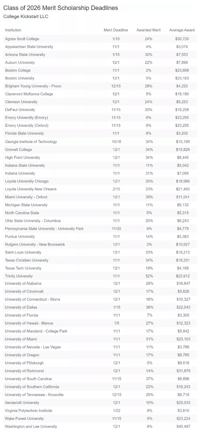 根据最新统计,2025届部分学校该类奖学金的截止日期,和去年获奖比例、平均金额,如下: