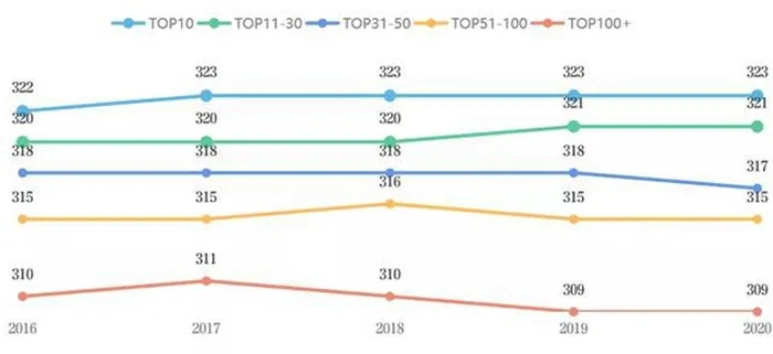 2016-2020美国不同排名区间院校GRE平均录取成绩