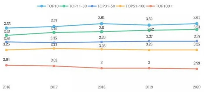 2016-2020美国不同排名区间院校GpA平均录取成绩