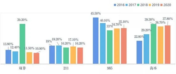 从TOp10院校来看,2020年美国研究生录取的主体依然是海本生及985背景的学生,海本申请者录取率为37.8%,略高于985本科申请者,可以看出名校背景在申请美国顶尖名校的过程中依然具备明显优势。