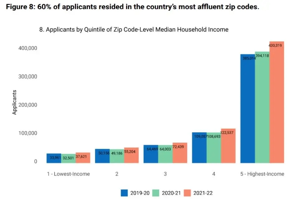 瑞卡德同时也指出,有数据显示,约六成的美国境内大学申请者来自全美范围内最为富裕的地区,而只有5%的申请者来自收入较低的地区,瑞卡德在对此数据表示忧心的同时,对解决这种(收入分配)差距还是抱有乐观的预期。