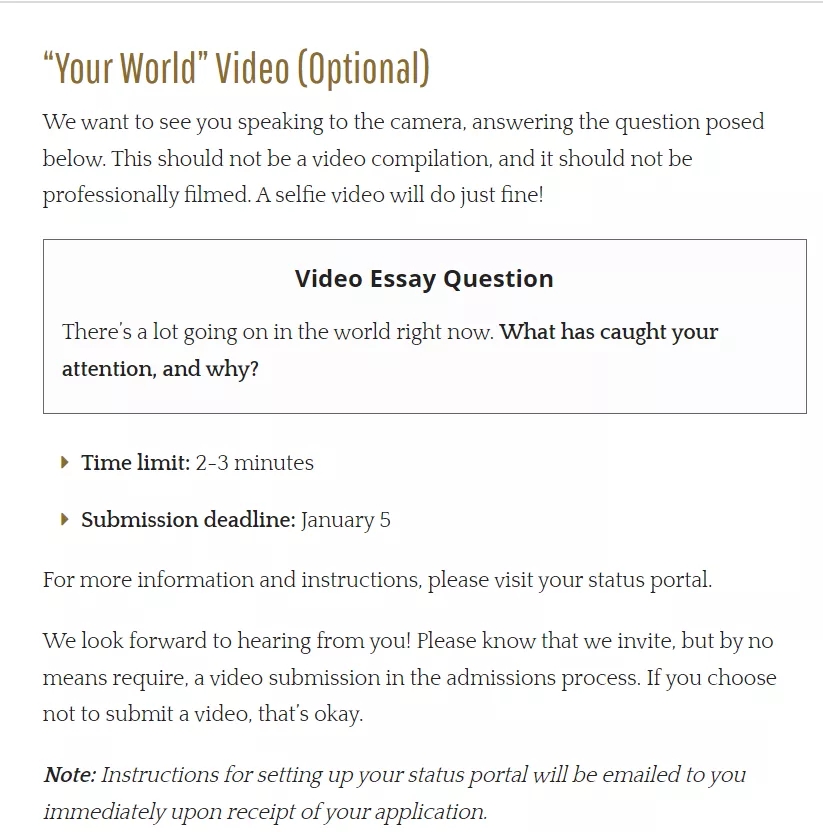 学生可以选择提交2分钟的视频介绍来替代面试,而面试不是录取过程的一部分。你不需要提前做大量练习或者修饰,也不需要针对视频进行编辑。