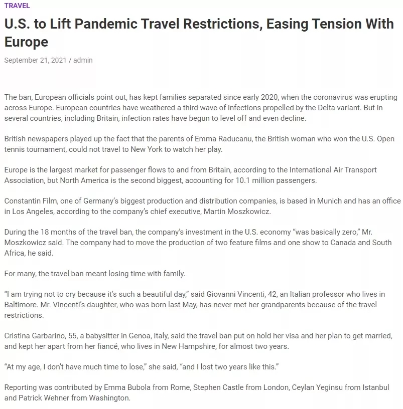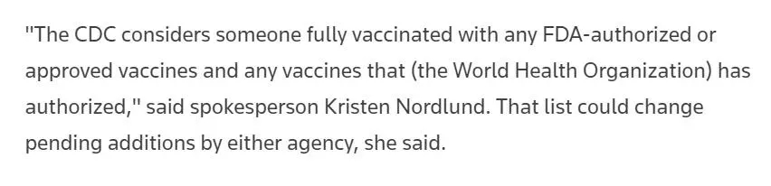 根据《纽约时报》最新报道,美国CDC发言人Thomas Skinner表示,只要你接种完由世界卫生组织(WHO)授权紧急使用的疫苗,就算是“打过疫苗”。也就是说完全接种FDA,或者是任何世界卫生组织(WHO)授权的疫苗,入境可免除隔离。
