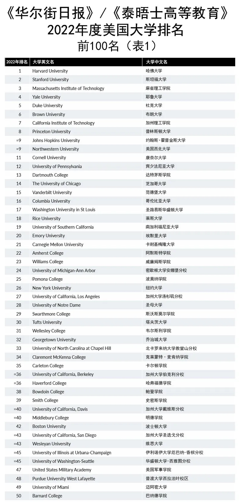 2022华尔街日报THE美国大学排名发布